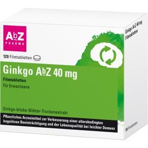 Wirkstoff: Ginkgo-biloba-Blätter-Trockenextrakt. Anwendungsgebiete: Ginkgo AbZ ist ein pflanzliches Arzneimittel zur Verbesserung einer altersbedingten kognitiven Beeinträchtigung und der Lebensqualität bei leichter Demenz. Warnhinweis: AM enth. Glucose, Lactose u. weniger als 1 mmol (23 mg) Natrium pro Filmtbl., d. h. es ist nahezu „natriumfrei“. Apothekenpflichtig.